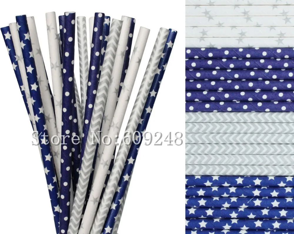 100 Pcs Hanukkah Drinking Paper Straws Mix,Silver Chevron and Star,Dark Navy Blue with Swiss Dot and Star,Graduation Party Craft