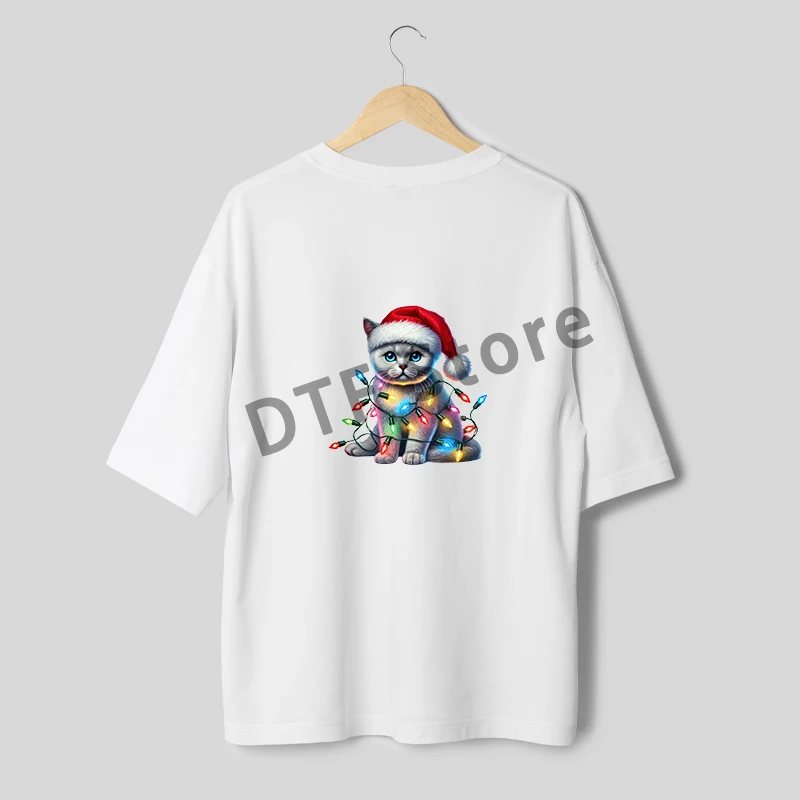 Christmas Camouflage Lamp Cat Iron on Stickers Animal Design DTF Heat Transfer Print Ready To Press For Clothing Patch