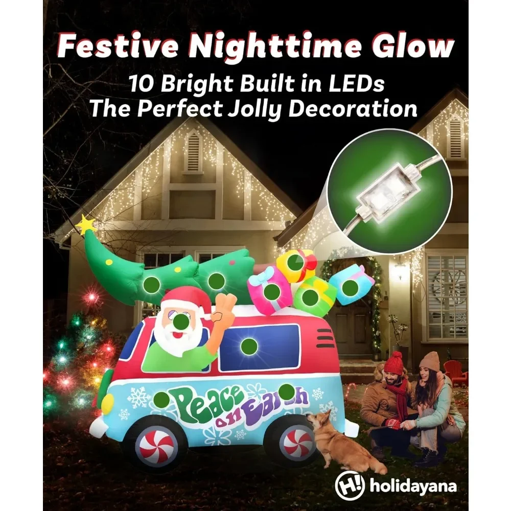 - BRIGHT CHRISTMAS DECOR - The Santa Hippie Van Yard Decoration will light up your winter nights! Equipped with 10 well-placed dual LED bulbs, it creates an enchanting sight that will be the focal point of your yard display.